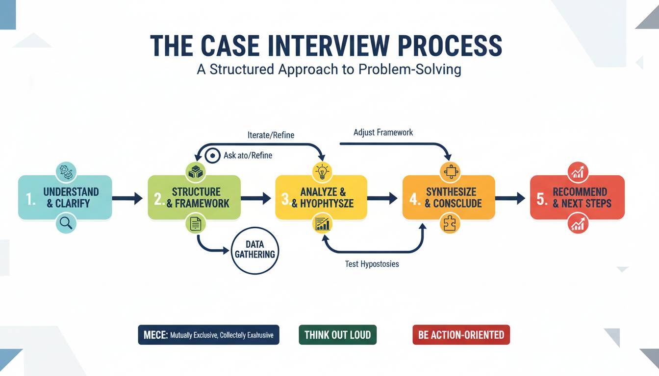 Clarify the question. This sounds obvious, but most candidates skip it. Before you build any framework, make sure you understand what success looks like. Ask: “Just to confirm, are we trying to understand why profits declined, or are we evaluating whether to enter a new market?” This buys you time, shows attention to detail, and gives the interviewer a chance to correct you before you go down the wrong path. Victoria B. Mgry, a former McKinsey interviewer who now runs CaseInterview.com, emphasizes that clarification questions are “free points” — they cost nothing and signal professionalism.