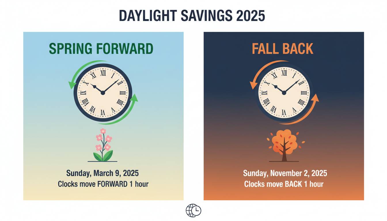 DST ends on Sunday, November 2, 2025. At 2:00 AM, clocks roll back to 1:00 AM, giving us an extra hour of sleep. Nights get darker earlier, but mornings are brighter.
