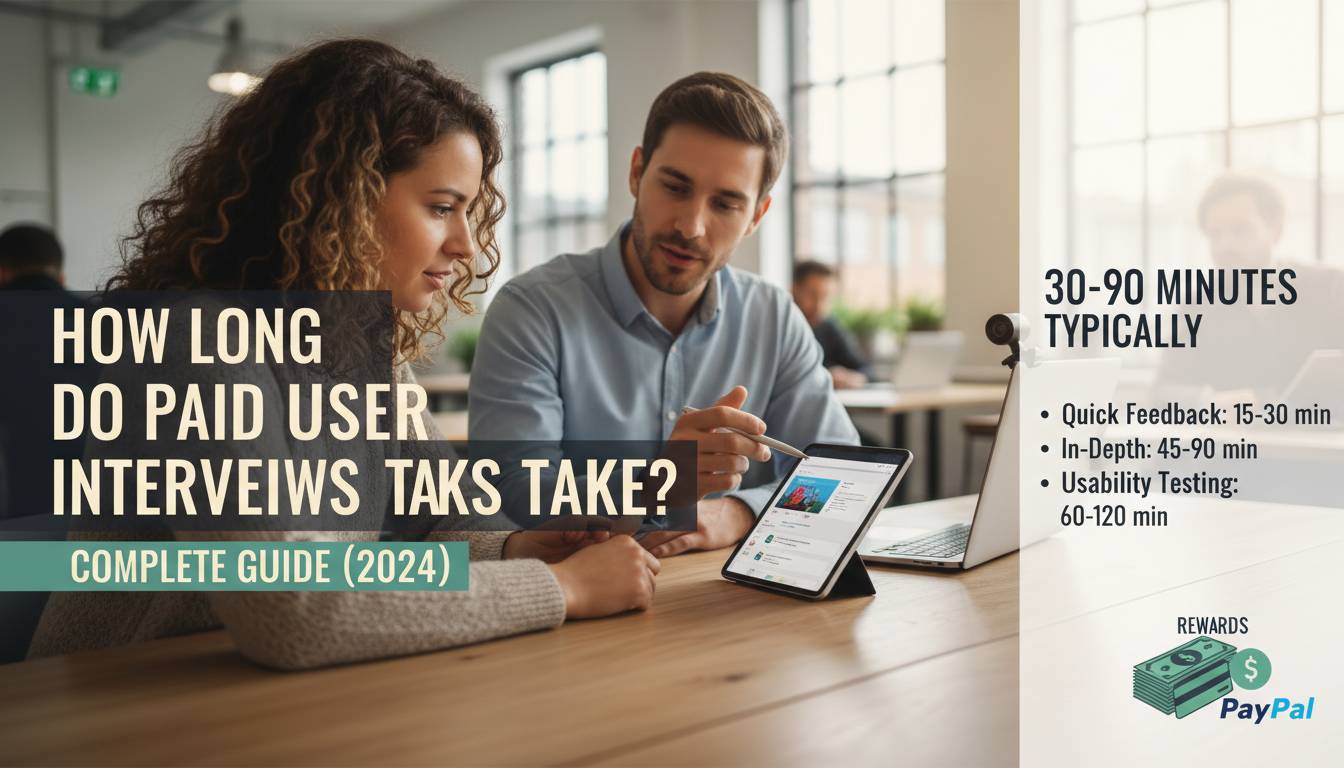 Paid user interviews typically take 30 minutes to two hours, with 45 minutes being the most common sweet spot. The exact duration depends on the methodology, the compensation, your experience level, and the specific platform.
