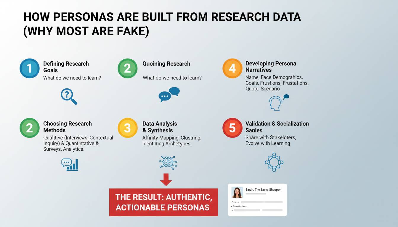 The difference between a real persona and a fake one isn’t polish. It’s methodology. A real persona emerges from systematic research, survives confrontation with disconfirming evidence, and changes how a team makes decisions. A fake persona looks beautiful in a slide deck and never influences a single product choice. This article shows you exactly how to build the former—and why the latter is so prevalent in the first place.