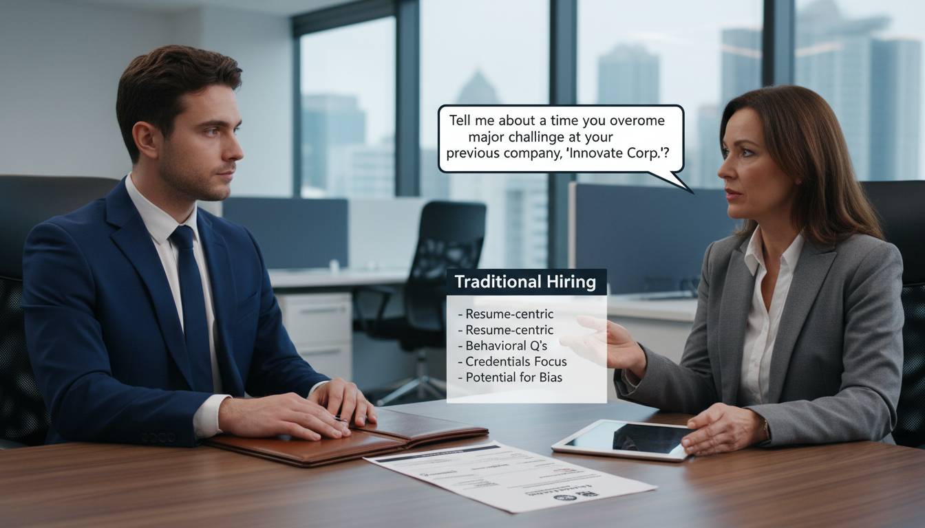 Traditional hiring—the approach most organizations still use—centers on credential matching. The process typically flows from resume screening based on keywords and qualifications, through HR-based interviews focused on background and fit, to hiring manager interviews that validate the candidate’s trajectory.
